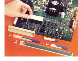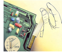 The gloves are "U" shaped channels with a .062" wide base to fit over standard boards and with fingers up to .750" long to fully sheath the edge mounted gold contacts. An extra piece of material is molded to the back edge of the protector allowing the board to lay flush with wave solder machine belts.